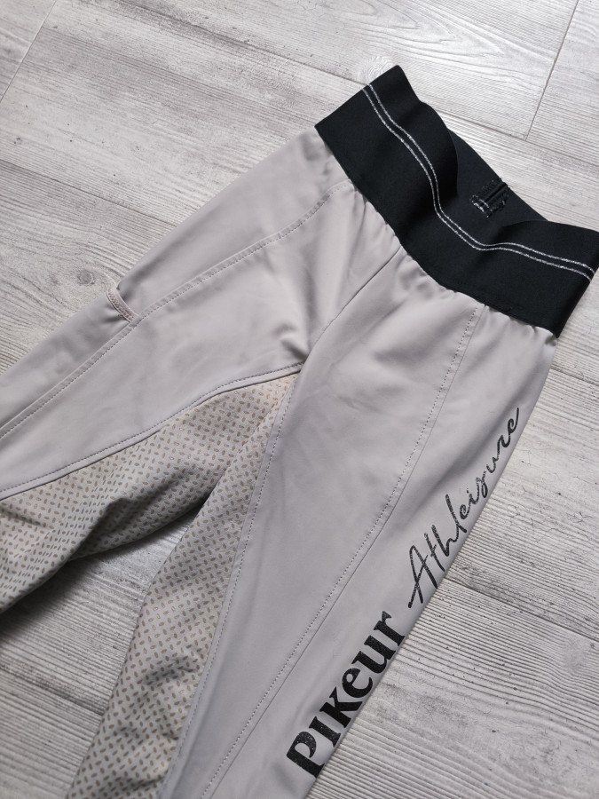 Breginsy Bryczesy leginsowe Pikeur. Beżowe jasne myślę że kolor idelany na zawody oraz treningu (jak na ostatnim zdj ). Mają fajny napis na udzie lekko glitterowy. Kieszeń na udzie co jest mega atutem i docenia to amazonki. Pas szeroki na gumie dopasujesz do talii. Stan wydaje się być bardzo dobry. Na pierwszy rzut oka nie zauważyłam jakichś wad czy zabrudzen. Rozmiar około 34 XS brak metki pas 30-35cm x2 dl całkowita 86 cm wysoki stan