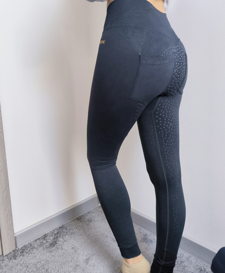 breginsy Bryczesy leginsowe pomme/ we are pomme. Niedostępne w Polsce! Perełka. Kolor taki szaro granatowy z vibem jeansu coś takiego. Ciężko idealnie określić. Materiał też trochę jak imitacja jeansu ale śliskie. Z kieszeniami na udzie co jest rzadkim zabiegiem w leginsach. Pas wysoki szeroki dobrze trzyma talie. Po założeniu wygodne. Stan bardzo dobry lekkie ślady użytkowania. Rozmiar nie znamy z metki , pasują najlepiej na XS 34 lub 36 S małe ! Pas 33-37 cm x2 dl całkowita 86 cm