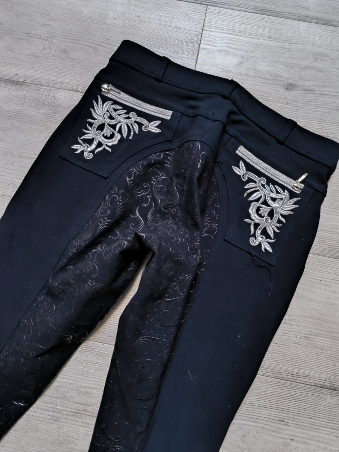 Bryczesy marka nieznana, ale myślę że to nie problem gdy mamy do czynienia z bardzo ładnie prezentującymi się spodniami. Granatowe. Są pienie zdobione. Zarówno na leju oraz na kieszeniach z cekinami. Dodaje im to uroku i chwytają za oko. Materiał miękki elastyczny. Nogawka Flexi. Stan bardzo dobry. Jedynie tam gdzie widać nitkę na kieszeni to jest 1 cm oderwania nitki. Do zszycia. Poza tym do przeprania. Rozmiar 42 xl pas 42 cm X2 biodra 47 cm Dl całkowita 94 cm wew 71 cm. Stan raczej wyższy +-23 cm