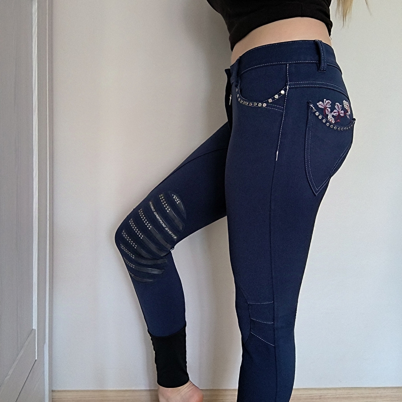 Bryczesy animo. Granatowe. Zdobione haftem z tyłu i dżetami. Wygodne. Ładnie leżą na sylwetce. Dla fanów niskich stanów. Z tego słynie marka animo. Stan ogólny bardzo dobry lekkie ślady użytkowania na materiale, leju. Lej kolanowy silikon mocno trzymający. Nogawka elastyczna. Rozmiar 36 S przez to że biodrówki to pas 38 cm x2 biodra 44 cm x2 dl całkowita 85 cm wew 67 cm.
