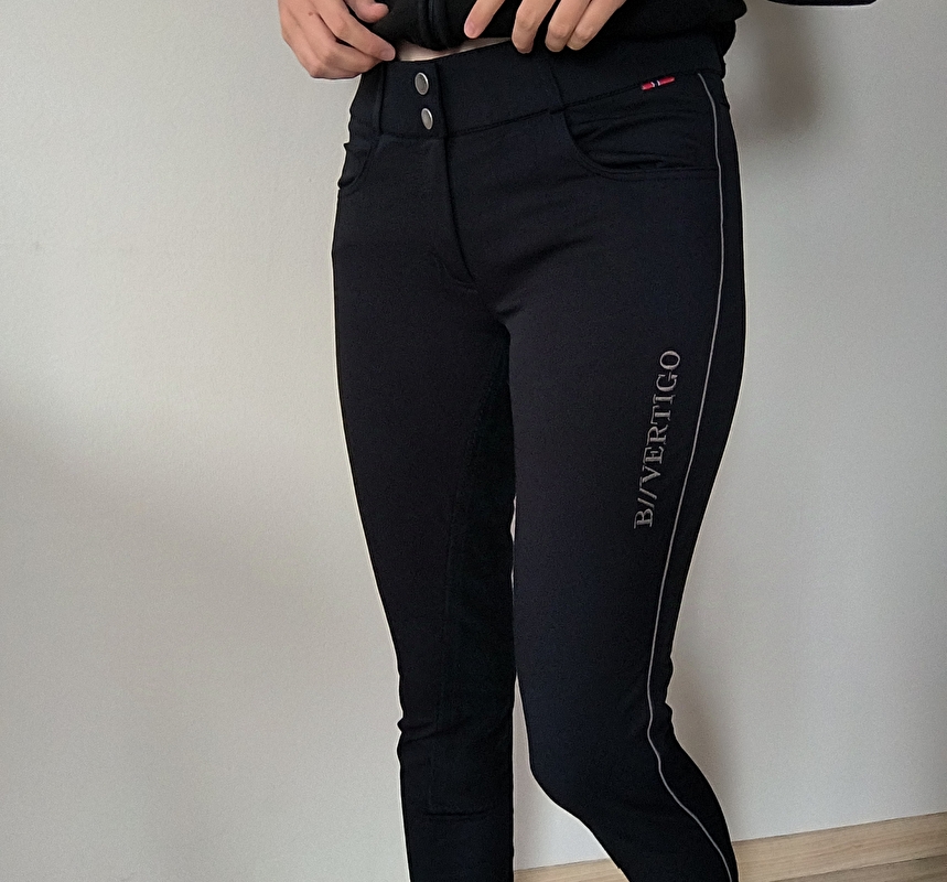 Bryczesy b//vertigo. Granatowe. Z szarym paskiem po boku. Ładnie wyglądają na sylwetce. Są wygodne. Lekko Softshellowe łatwe w czyszczeniu. Lej zamsz pełny. Nogawka Flexi. Stan bardzo dobry. Rozmiar 40 L pas 39 cm x2 biodra 45 cm x2 dl całkowita 87cm standardowy stan