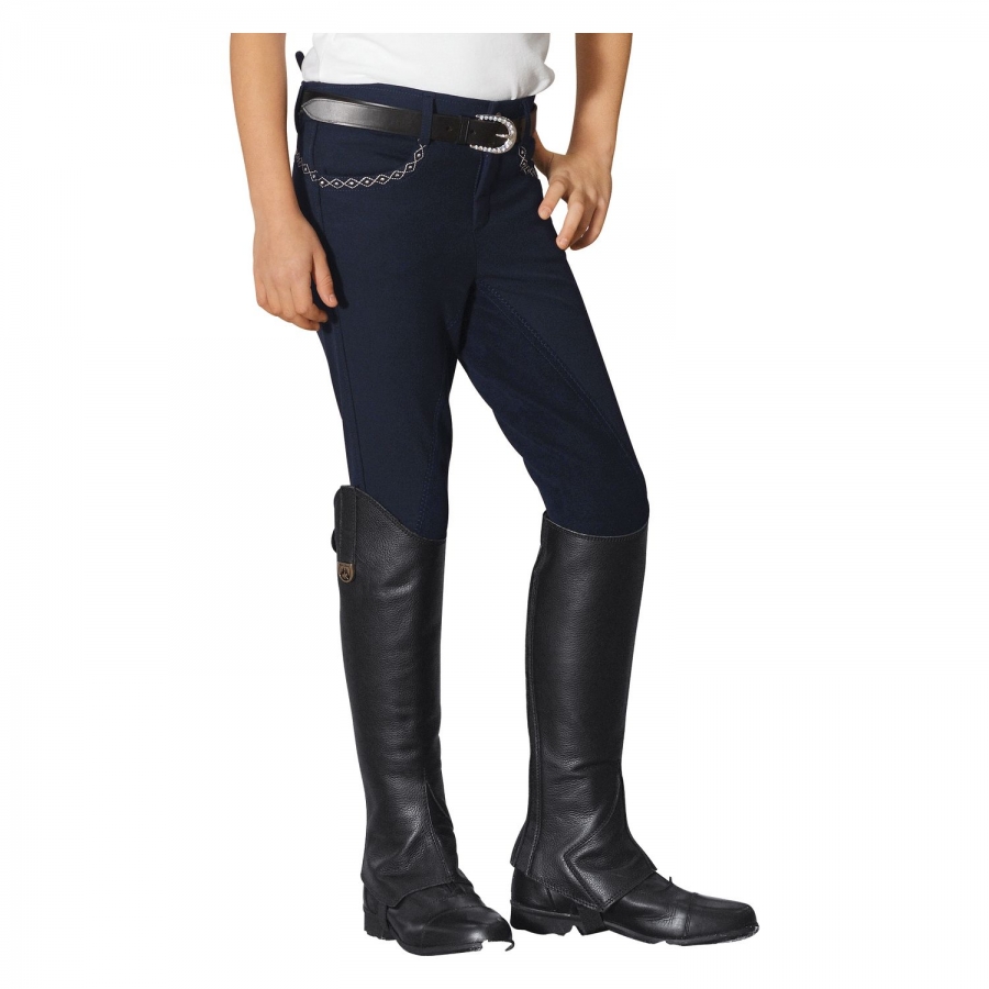 Wygodne bryczesy z Cavallo o wysokiej jakości elastycznej tkaniny. Z dwiema przednimi kieszeniami, lejem 3/4 i elastycznymi mankietami u dołu nogawek. Ozdobny guzik z połyskującym kamieniem i wyszukane, srebrne aplikacje haftowane Lurex z przodu i tyłu paska są wyjątkowo piękne.
