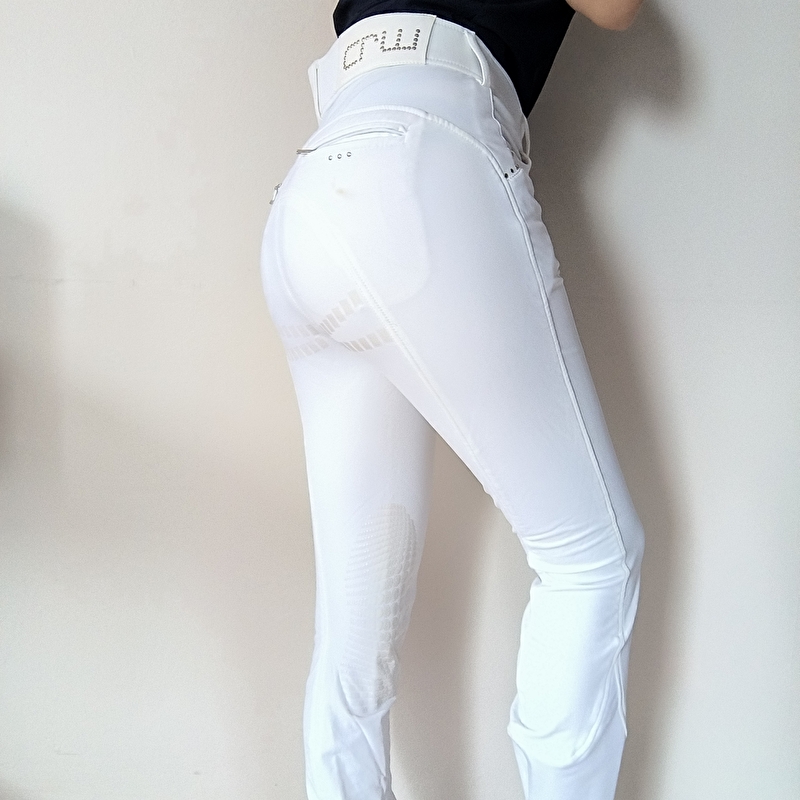Bryczesy crw. Konkursowe białe. Z lekkimi zdobieniami. Bardzo eleganckie. Wygodne. Z lejem silikonowym pod pośladkami i na kolanach super trzyma.