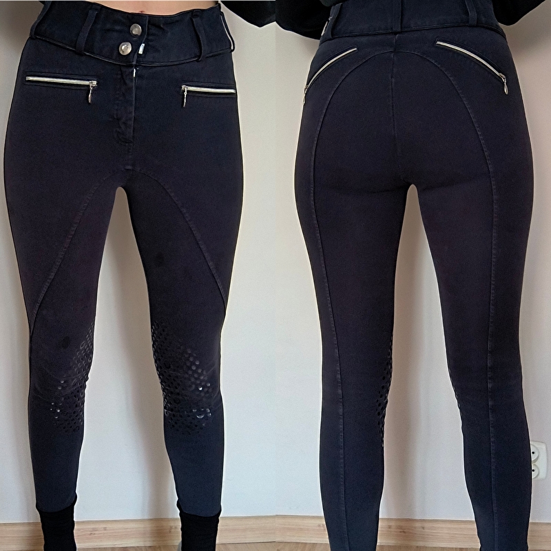Bryczesy Equestrian Stockholm. Stan dobry. Kolor wygląda na lekko sprany. Przy kolanie plamka. Lej silikonowy kolanowy w stanie bardzo dobrym nie starty. Rozmiar 36 pas 34-36 cm x2 biodra 40 cm x2 dl wew 73 cm zew 93 cm. Standardowy stan.