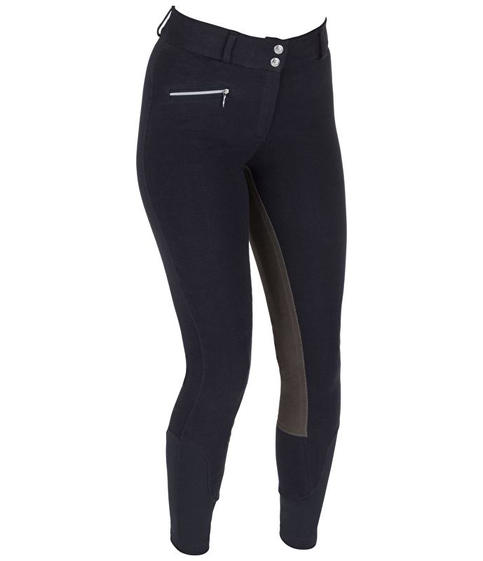 Bryczesy damskie z pełnym lejem z imitacji skóry. Materiał jest bardzo elastyczny i super miękki. 1 przednia kieszeń na suwak, elastyczny, szeroki pas z 2 guzikami, elastyczne zakończenia nogawek bez rzepów. 95% bawełna, 5% spandex.