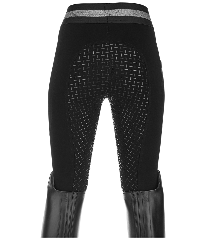 Sportowe, bardzo wygodne legginsy jeździeckie i wykonane z wysokiej jakości, oddychającego, elastycznego materiału 4-way stretch z pełnym silikonowym lejem. Elastyczny pas z brokatem, kieszeń na telefon komórkowy na nogawce, elastyczny koniec nogawki bez rzepów. 68% wiskoza, 27% poliamid, 5% elastan.