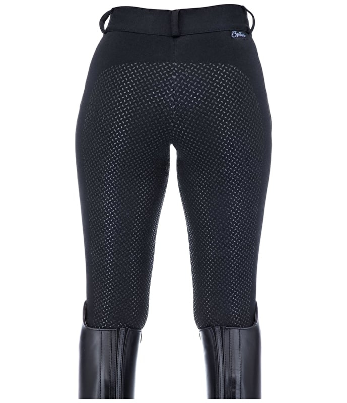 Wygodne damskie bryczesy z pełnym siedziskiem wykonanym z silikonu. Zapewnia idealne trzymanie w siodle. Elastyczne mankiety nogawek bez rzepów. Żadnych irytujących szwów na kolanach. Materiał jest bardzo elastyczny i super miękki. 1 przednia kieszeń na suwak, elastyczny, szeroki pas. 95% bawełna, 5% elastan.