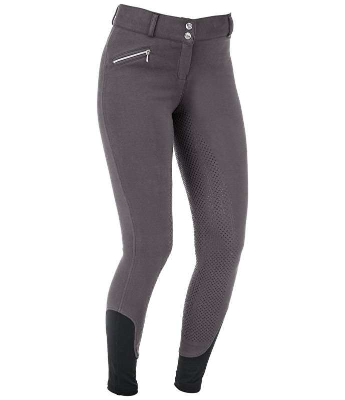 Wygodne damskie bryczesy z pełnym siedziskiem wykonanym z silikonu. Zapewnia idealne trzymanie w siodle. Elastyczne mankiety nogawek bez rzepów. Żadnych irytujących szwów na kolanach. Materiał jest bardzo elastyczny i super miękki. 1 przednia kieszeń na suwak, elastyczny, szeroki pas. 95% bawełna, 5% elastan.