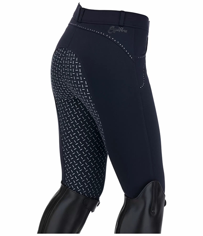 Niezwykle wygodne, oddychające bryczesy z pełnym lejem dla dzieci wykonane z rozciągliwego, super miękkiego materiału rozciągającego się w 4 kierunkach z błyszczącym pełnym lejem silikonowym. Ozdobne cyrkonie na przednich kieszeniach, elastyczne zakończenia nogawek bez materiału Velcro. 68% wiskoza, 27% poliamid, 5% elastan.