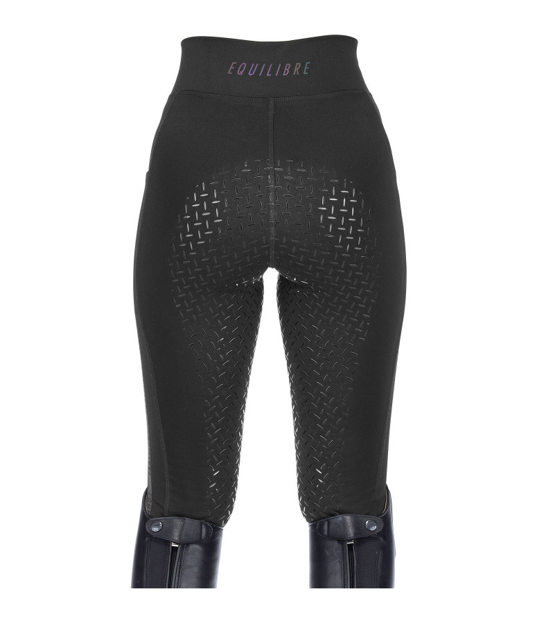Sportowe legginsy jeździeckie dla dzieci z holograficznym nadrukiem logo, wykonane z elastycznego, oddychającego i supermiękkiego materiału rozciągliwego w czterech kierunkach. Posiadają pełny silikonowy lej, dwie przednie kieszenie na telefon komórkowy oraz stylowe, wielokolorowe, połyskujące nadruki foliowe po bokach i z tyłu. 86% poliester, 14% elastan.