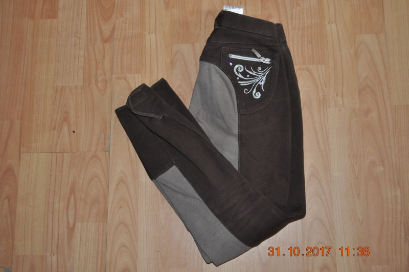 Posiadam na sprzedaż bryczesy firmy Equilibre w rozmiarze 176. Bryczesy brązowe, z pełnym szarym lejem. Zdobione haftami na tylnych kieszeniach. Dodatkowo wstawione zamki. Dwie kieszonki na zamek z przodu. Zdobienia w kontrastowym kolorze. Używane, w bardzo dobrym stanie.
