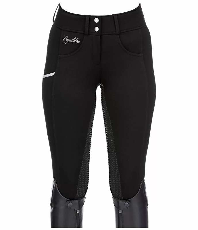 Super wygodne spodnie z wysokim stanem wykonane z miękkiego, elastycznego materiału z pełnym silikonowym lejem bez szwów na kolanach. Kieszeń na telefon komórkowy z boku i haft z przodu i z tyłu, tylna kieszeń na suwak. Elastyczne końce nogawek bez rzepów.