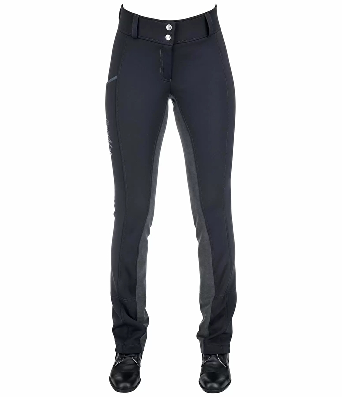 Przytulne, ciepłe zimowe bryczesy jodhpur z pełnym lejem z elastycznej skóry syntetycznej. W środku wygodne, puszyste i wiatroszczelne. Lekko rozszerzana nogawka z gumowym paskiem o regulowanej długości, elastyczny, szeroki pas, 1 duża kieszeń na telefon komórkowy na nogawce, 1 kieszeń na zamek błyskawiczny z tyłu. Na zewnątrz 88% nylon, 12% elastan, wewnątrz 100% poliester.