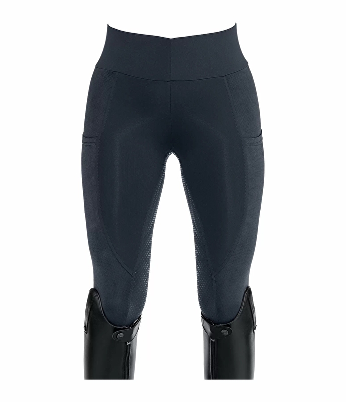 Sportowe, hybrydowe legginsy do jazdy konnej wykonane z rozciągliwego, bardzo miękkiego, elastycznego materiału z szerokimi wstawkami z siateczki na nogawkach. Pełne siedzisko wykonane z silikonu. Oddychający, szybkoschnący, rozciągliwy w 4 kierunkach. Wstawki z siateczki zapewniają optymalną wentylację. Bardzo szeroki pas, 2 kieszenie na telefon komórkowy na nogawkach, brak szwów kolanowych, elastyczne zakończenia nogawek bez rzepów. Materiał: 86% nylon, 14% elastan, wstawki z siatki 95% poliester, 5% elastan.