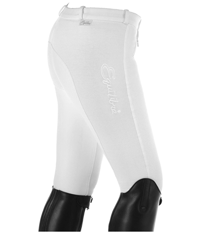 Modne bryczesy dla dzieci z pełnym lejem marki Equilibre są fantastycznie wygodne i mają modny dwukolorowy wygląd. Nora ma naszytą syntetyczną rozciągliwą lamówkę, która rozciąga się od pośladków do łydek i zapewnia antypoślizgowe dopasowanie i lepszą przyczepność między jeźdźcem a gładką powierzchnią siodła. Funkcjonalny materiał jest rozciągliwy i dopasowuje się do ciała. Elastyczny pas zapewnia stabilne dopasowanie spodni, a także jest wyposażony w mocne szlufki, do których można przyczepić kieszeń na telefon komórkowy itp. Innowacyjny koniec nogawek bryczesów z pełnym lejem nie wymaga zapięcia na rzepy, jest elastyczny i czysty. Oprócz wysokiego poziomu komfortu, bryczesy z pełnym lejem Equilibre zachwycają oddychającymi, szybkoschnącymi i łatwymi w pielęgnacji właściwościami materiału. Wyszywany napis Equilibre na udzie i mała kieszonka na suwak są szczególnie piękne. Materiał 92% bawełna, 8% elastan. Można prać w pralce w 30 ° C.