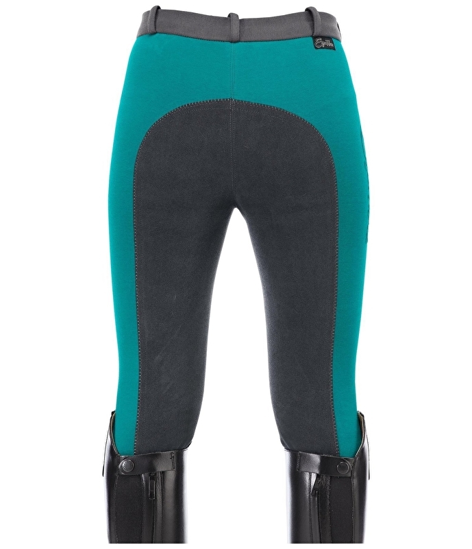 Modne bryczesy dla dzieci z pełnym lejem marki Equilibre są fantastycznie wygodne i mają modny dwukolorowy wygląd. Nora ma naszytą syntetyczną rozciągliwą lamówkę, która rozciąga się od pośladków do łydek i zapewnia antypoślizgowe dopasowanie i lepszą przyczepność między jeźdźcem a gładką powierzchnią siodła. Funkcjonalny materiał jest rozciągliwy i dopasowuje się do ciała. Elastyczny pas zapewnia stabilne dopasowanie spodni, a także jest wyposażony w mocne szlufki, do których można przyczepić kieszeń na telefon komórkowy itp. Innowacyjny koniec nogawek bryczesów z pełnym lejem nie wymaga zapięcia na rzepy, jest elastyczny i czysty. Oprócz wysokiego poziomu komfortu, bryczesy z pełnym lejem Equilibre zachwycają oddychającymi, szybkoschnącymi i łatwymi w pielęgnacji właściwościami materiału. Wyszywany napis Equilibre na udzie i mała kieszonka na suwak są szczególnie piękne. Materiał 92% bawełna, 8% elastan. Można prać w pralce w 30 ° C.