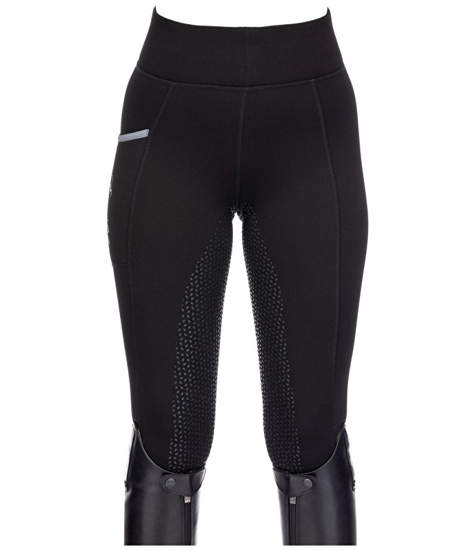 Super przytulne i ciepłe zimowe jeździeckie legginsy na szczególnie mroźne dni! Niezwykle dobre i wygodne dopasowanie dzięki miękkiemu, elastycznemu materiałowi rozciągliwemu w 4 kierunkach z puszystym wnętrzem. Pełne silikonowe siedzisko, boczna kieszeń na telefon komórkowy i bardzo szeroki pas z kieszenią na suwak. 60% poliester, 30% poliamid, 10% elastan.