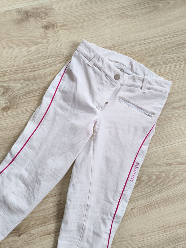 Bryczesy Equiline. Konkursowe białe. Przepięknie wykonane. Mają elegancki krój, z różowymi elementami które optycznie zwężają i modelują. Na nodze siateczka do lepszej wentylacji ciała. Nie zauważyłam zbytnio zabrudzen. Jeśli jakiekolwiek są to naprawdę minimalne. Rozmiar najlepiej pasuje na XS