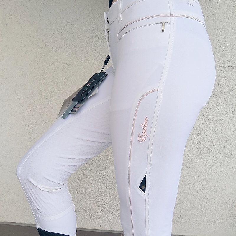 Bryczesy konkursowe białe na zawody jeździeckie z Equiline. Model niedostępny w Polsce! Piękne przeszycia, super wygodne mega przyjemny materiał. Są elastyczne. Mają kieszonki na zamek. Nie używane, jednak mają małe ślady magazynowania do wyprania. Rozmiar 38 (it44).