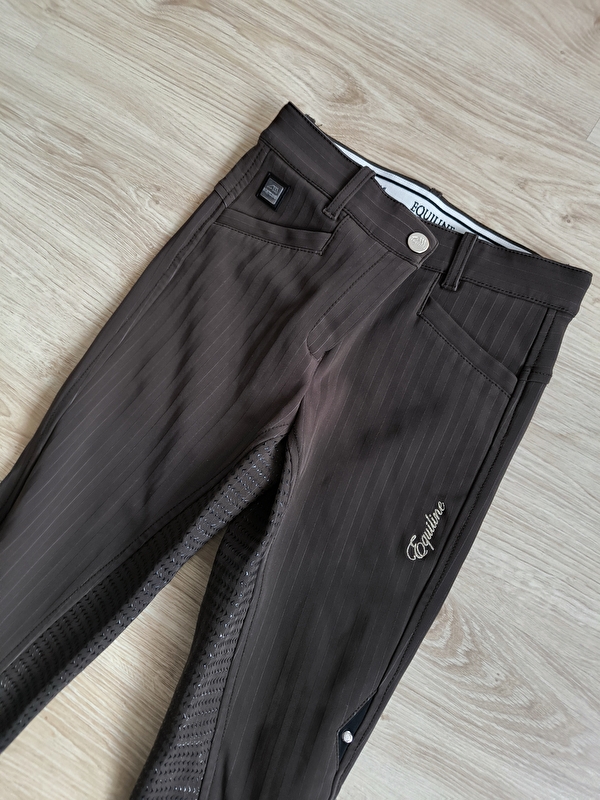 Bryczesy Equiline. Brązowe. W pięknym wzorze coś na styl old money. Bardzo eleganckie przez te prążki w jednym kolorze. Z napisem na udzie. Nogawka Flexi. Wygodne przy dopasowaniu. Stan bardzo dobry. Na plakietkach lekkie zarysowania. Rozmiar XS wąskie standard. Metka it38 , de 34