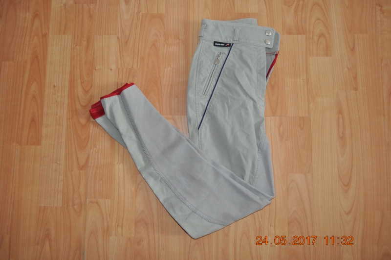 Posiadam na sprzedaż szare bryczesy Euro Star model Petra. Dwie przednie kieszenie na zamek, granatowa lamówka przy kieszeniach. Wysoki stan, pełny lej. Rozmiar z metki 80, odpowiednik 38. Plamki przy jednej kieszeni.