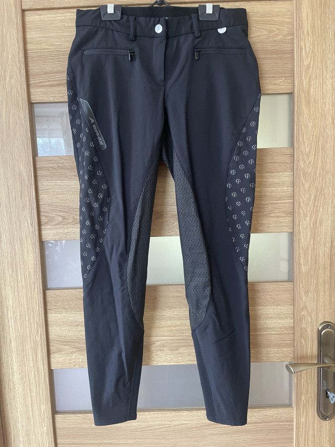 Sprzedam czarne, elastyczne bryczesy Euro-Star w rozmiarze powiedziałabym 38/40 choć na metce jest 36. Użyte może 1-2 razy, wyprane. Lej pełny, silikonowy, nienaruszony, dobrze trzymający w siodle, elastyczne wstawki na nogach. Po bokach biały nadruk zdobienia. 2 nie za duże kieszenie z przodu na zamek- telefonu tam nie zmieścimy. Stan do pasa. W pasie po wewnątrz wstawiony pasek silikonowy dla lepszego trzymania, szlufki.