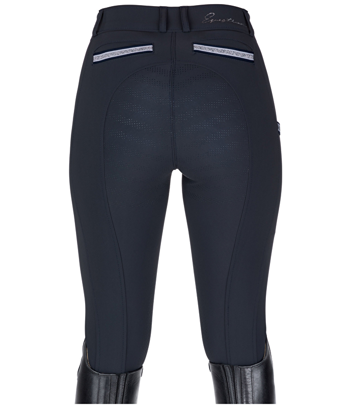 Eleganckie bryczesy z silikonowym lejem na pośladkach i kolanach. Wysokiej jakości materiał posiada następujące właściwości: 4-WAY stretch, oddychający, trwale elastyczny, wytrzymały, szybkoschnący i łatwy w pielęgnacji. Świetne aplikacje z brokatem na wszystkich kieszeniach. 2 wsuwane kieszenie z tyłu, 1 wsuwana kieszeń na telefon komórkowy z boku, elastyczny, szeroki pas zapinany na 2 guziki, brokatowy haft Felix Bühler z przodu i z tyłu, bez szwów kolanowych, elastyczne końcówki nogawek wykonane ze streczu. 77% nylon, 23% elastan.