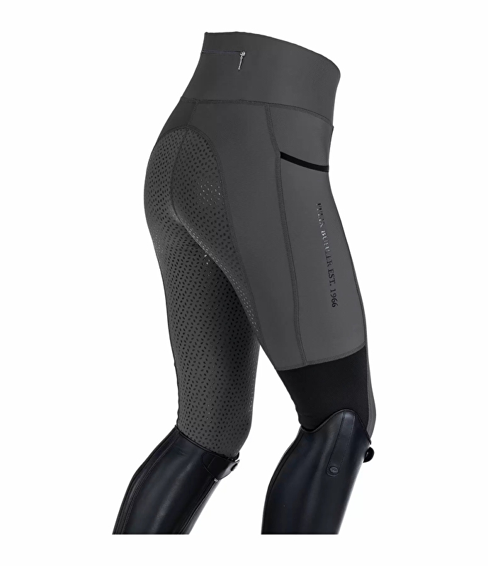 Wygodne legginsy jeździeckie wykonane z rozciągliwego materiału 4-way stretch z pełnym silikonowym lejem. Wstawki z siateczki na nogawkach zapewniają doskonałą wentylację. Szeroki pas z podwyższonym rozcięciem z tyłu, z tyłu kieszeń na zamek, z boku kieszeń na telefon komórkowy, bez szwów kolanowych, elastyczne zakończenia nogawek. 90% nylon, 10% elastan.
