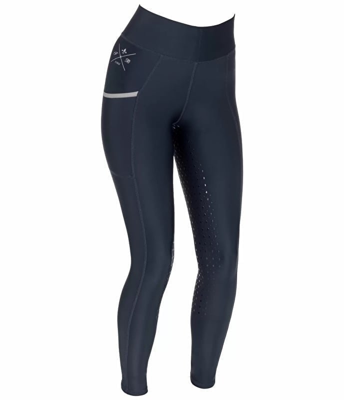 Niezwykle wygodne legginsy jeździeckie wykonane z wysokiej jakości elastycznego 4-way stretch materiału z pełnym silikonowym lejem. Bardzo szeroki pas, kieszeń na suwak z tyłu, boczna kieszeń na telefon komórkowy, brak irytujących szwów na kolanach, elastyczne końce nogawek, różne silikonowe nadruki Felix Bühler. 90% nylon, 10% elastan.