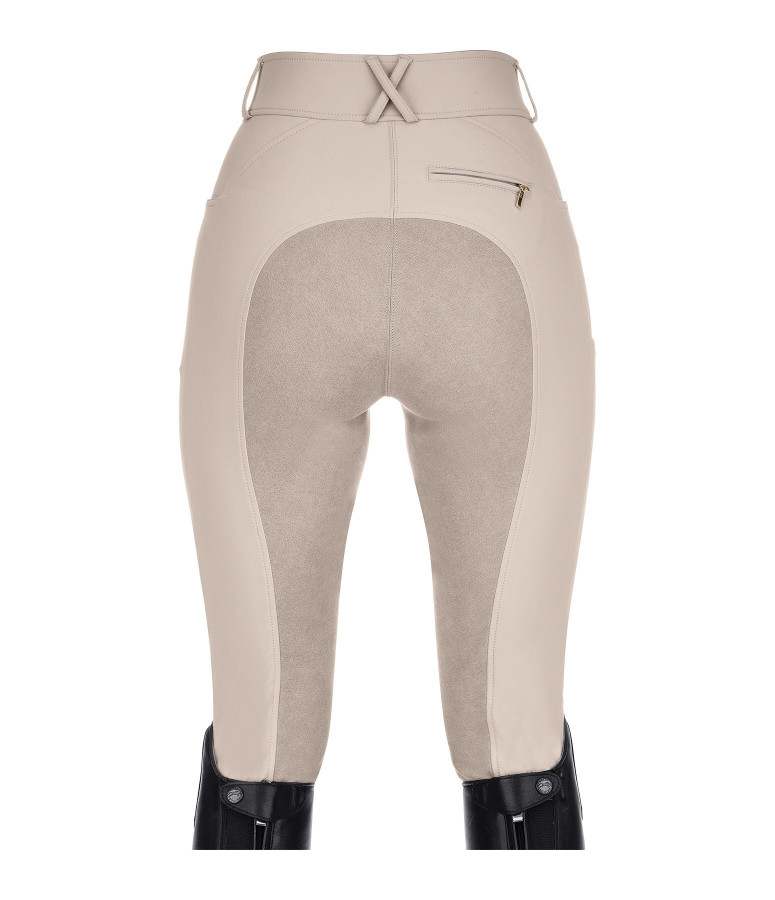 Klasyczny design łączy się z nowoczesnym komfortem. Funkcjonalne bryczesy z pełnym lejem wykonane z elastycznej skóry syntetycznej. Elastyczny materiał jest wodoodporny, oddychający, trwały i łatwy w pielęgnacji. Jedna duża kieszeń na telefon komórkowy na zewnętrznej stronie nogawki, dwie kieszenie z przodu, jedna kieszeń zapinana na zamek z tyłu oraz szeroki, elastyczny pas. Elastyczne ściągacze nogawek bez rzepów. 89% nylon, 11% elastan.