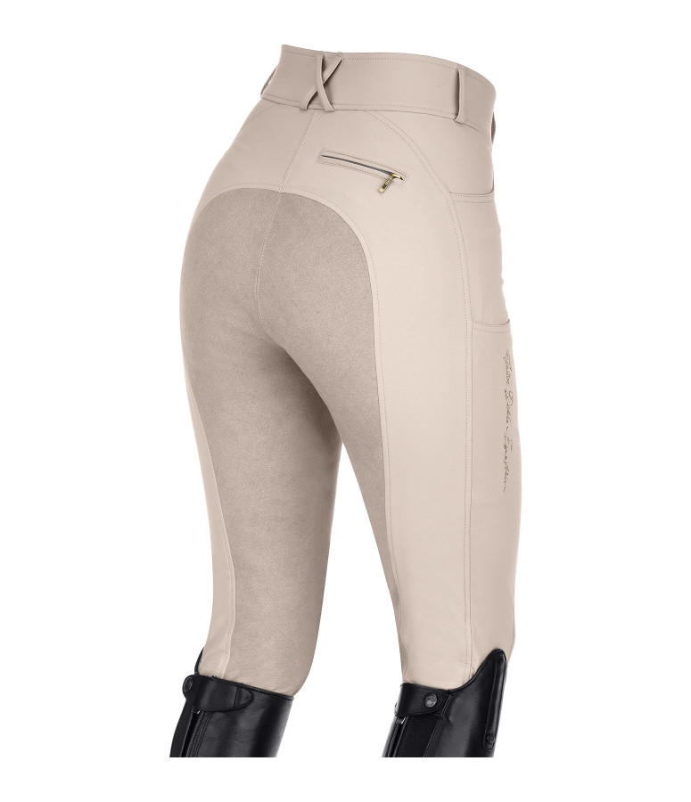 Klasyczny design łączy się z nowoczesnym komfortem. Funkcjonalne bryczesy z pełnym lejem wykonane z elastycznej skóry syntetycznej. Elastyczny materiał jest wodoodporny, oddychający, trwały i łatwy w pielęgnacji. Jedna duża kieszeń na telefon komórkowy na zewnętrznej stronie nogawki, dwie kieszenie z przodu, jedna kieszeń zapinana na zamek z tyłu oraz szeroki, elastyczny pas. Elastyczne ściągacze nogawek bez rzepów. 89% nylon, 11% elastan.