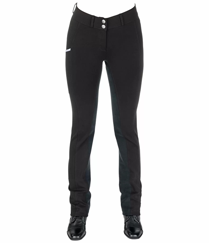 Wygodne bryczesy z pełnym lejem wykonane z imitacji skóry. Elastyczny, szeroki pas zapinany na 2 guziki, 1 kieszeń na suwak z tyłu, kieszonka na telefon komórkowy na nogawce, haft Felix Bühler na plecach, krój bootcut, gumowy pasek z regulacją długości. Materiał jest bardzo elastyczny i super miękki. Materiał: 68% wiskoza, 27% nylon, 5% elastan.