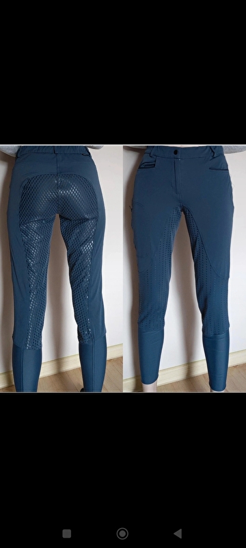 Bryczesy Fouganza. Niebieski granatowe Cienkie. Jak druga skóra. Wygodne bardzo. Lej silikony pełny z dodatkowym zagięciem kolan co poprawia przyczepnosc do siodła. Mają kieszeń na udzie która mieści telefon. Świetne budżetowe Bryczesy.