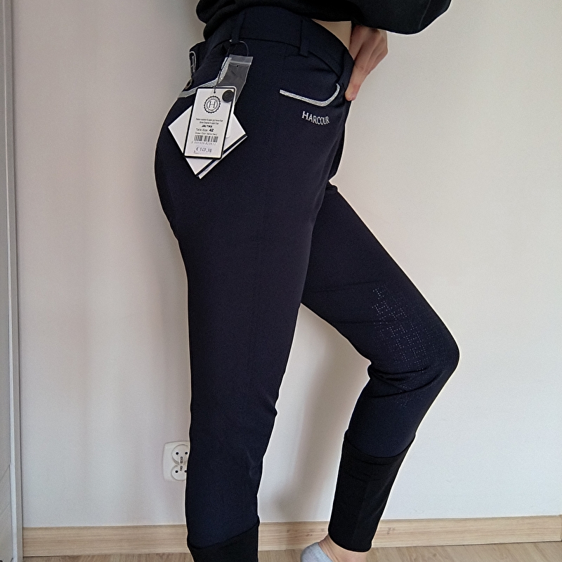 Bryczesy Harcour. Granatowe z pięknymi srebrnymi elementami. Softshellowe wodoodporne. . Mega wygodne i elastyczne. Ślicznie wyglądają na sylwetce. Mają mocny silikonowy kolanowy lej.