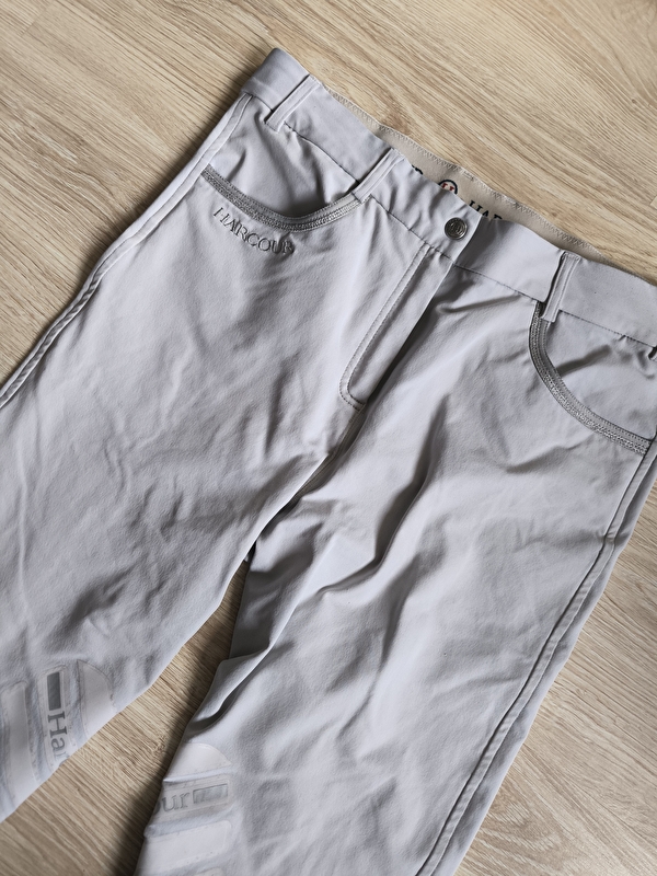 Bryczesy Harcour. Szare. Być może można w nich startować ale trzeba by dopytać bo nie do końca jestem pewna :). Są bardzo wygodne. Mają przyjemny elastyczny materiał. Kolanowy silikon mocno trzyma. Ma lekkie zabrudzenia. Mało widoczne. Poza tymlekkie ślady użytkowania. Rozm XL 42 wysoki stan