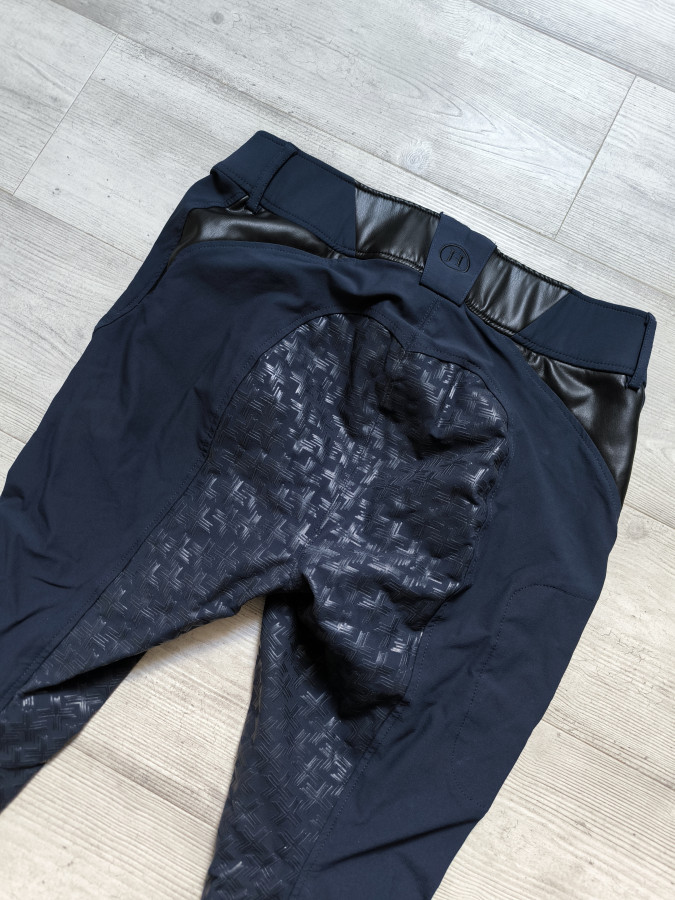 bryczesy jh collection. Granatowe z ciekawymi skórzanymi wstawkami. Bardzo wygodny materiał elastyczny komfortowy. Mają pełny silikon. Nogawka Flexi. Stan bardzo dobry ale są całe do wyprania ! Poza tym fajny stan.