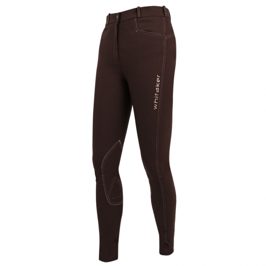 Sprzedam brązowe bryczesy firmy John Whitaker z lejem kolanowym. Z przodu dwie wsuwane kieszenie, przy leju kontrastowe białe przeszycia, z boku na nogawce logo firmy.