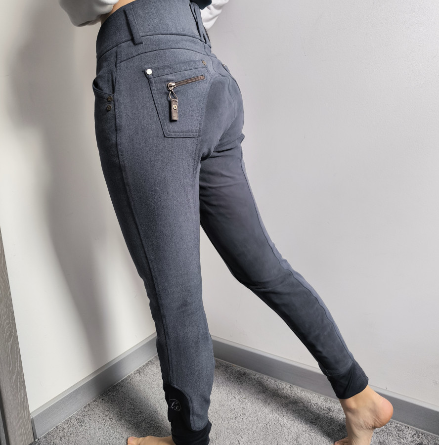 Bryczesy lauria garelii. Szare trochę w stylu jeansowym z skórzanymi wstawkami na zamkach. Całkiem ciekawe i stylowe. W nowoczesnym designie. Mimo materiału są wygodne i Elastyczne. A lej Jest pełny zamsz. Nogawka Flexi. Stan bardzo dobry lekkie ślady użytkowania. Są Do wyprania mają ślady użytkowania na logo na dole nogawki . Rozmiar 40 L pas 41 cm x2 biodra 49 cm x2 dl całkowita 92 cm wew 68 cm stan z przodu standardowy z tyłu wyższy