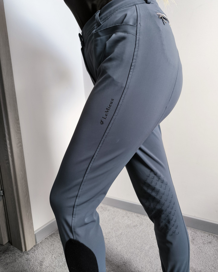 Bryczesy Lemieux. Szare. Z ładnymi Kryształkami na kieszeniach. Dodaje im to elegancji. Poza tym mają napis silikonowy na udzie. Materiał jest śliski elastyczny. Są to Bryczesy idelane dla osób które mają większą różnice cm między talia a biodrami. Wtedy będą ładnie leżeć i się dopasują. Stan bardzo dobry ale do wyprania. Rozmiar 38 M pas 37 cmx2 biodra 47 cm x2 wysoki stan