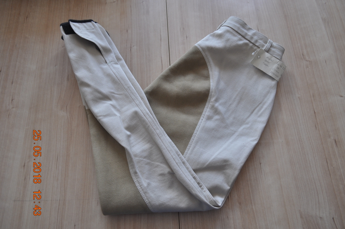 Nowe bryczesy marki Moorkens model Derby III. Bryczesy w rozmiarze 38. Beżowe, z ciemniejszym lejem. Nogawki zakończone rzepem. Kieszonka z przodu na zamek. Materiał: bawełna 94 %, spandex 6%.