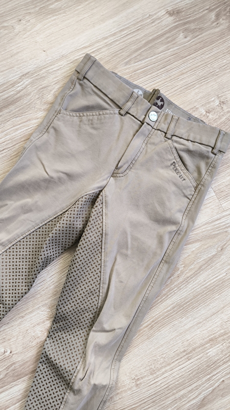 Bryczesy beżowe Pikeur. Bezowy kolor jasny nadaje sie zarówno na treningi jak i zawody jeździeckie. Bardzo wygodne i elastyczne. Renomowana marka zapewnia swietny komfort, idealne dla młodego adepta jeżdziectwa Super stan bez wad. Rozmiar młodzieżowe około 152/158 pas 31 cm x 2 biodra 35 cm x 2 długość całkowita 77 cm długość wewnętrzna 59 cm niski stan.