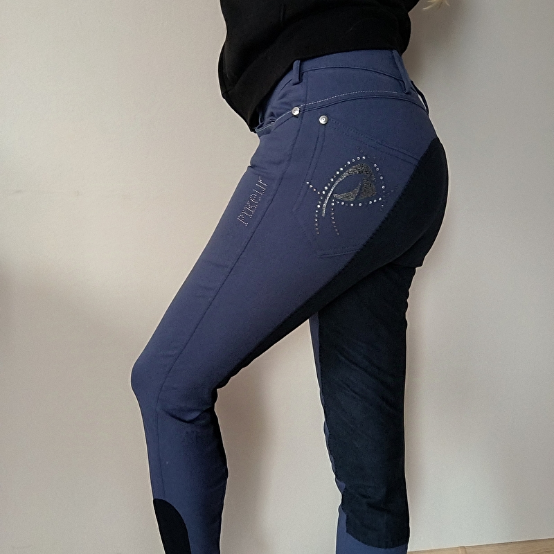 Bryczesy Pikeur. Kolor wydaje się być granatowo fioletowy. Pięknie wykonane. z kryształkami na kieszeniach i dzetami na udzie. Super stylowe. Bardzo wygodne elastyczne jak to pikeur. Lej chyba skórzany. Stan bardzo dobry. Lekkie ślady użytkowania. Rozmiar 38 pas 37 cmx2 biodra 42 cm X2 dl całkowita 85 cm standardowy stan