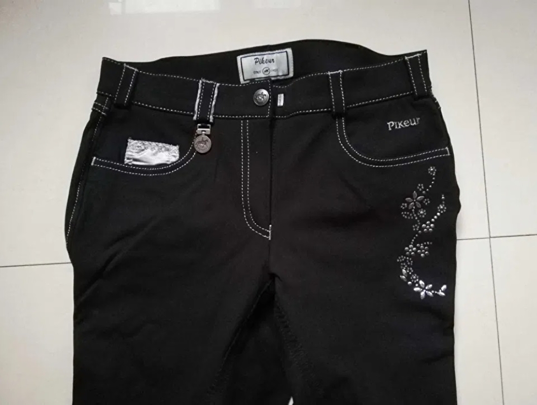 Sprzedam świetne bryczesy Pikeur, model Felina. Rozmiar 38 (M). Wykonane z bawełny, z pełnym lejem zamszowym. Nogawki flex. Z przodu piękne zdobienie z kryształków. Całe bryczesy bardzo eleganckie, przeszycia wykonane srebrną nitką.
