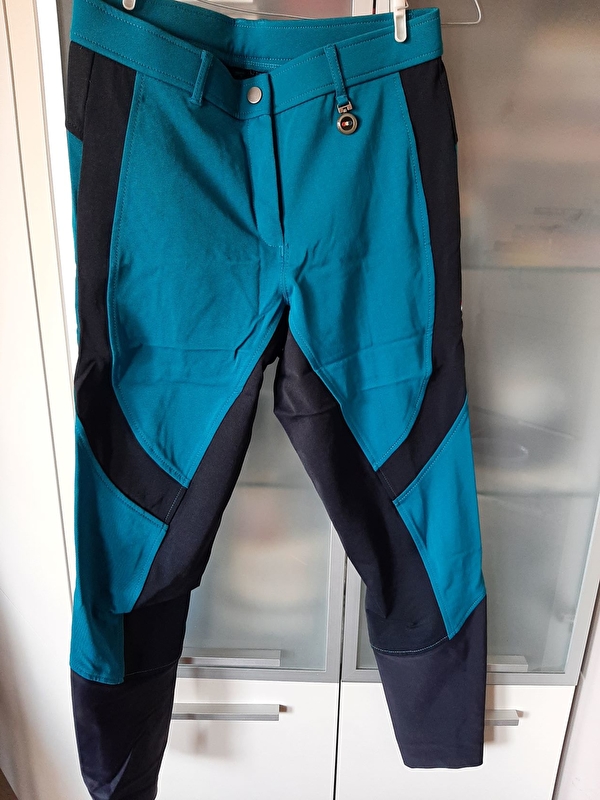 Nowe turkusowe bryczesy z kontrastującymi ciemnymi wstawkami, pięknie się prezentują. Materiał super na lato, bardzo wygodne. Lej, wg producenta, jest materiałowy, ale moim zdaniem to zasadniczo go nie ma - nie ma naszytej na nogawkę warstwy materiału, dół nogawek z elastycznego materiału. Rozmiar to brytyjska 10tka (EU 38), dość mała. Koszt to 150 zł + kw.