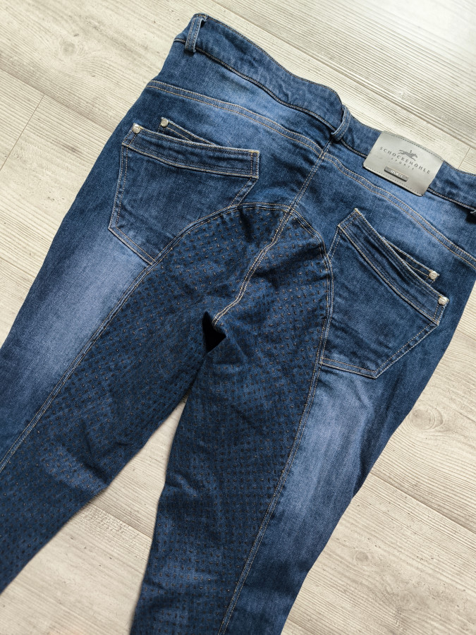 Bryczesy Schockemohle. Piękne jeansowe mega stylowe i nowoczesne. Mimo że jeans to wygodny i komfortowy. Pełny lej silikonowy dobrze trzyma. Stan bardzo dobry. Na plakietce lekkie przybrudzenie. Rozmiar XL pas 42 cm X2 biodra 47 cm x2 dl całkowita 94 cm wyższy stan