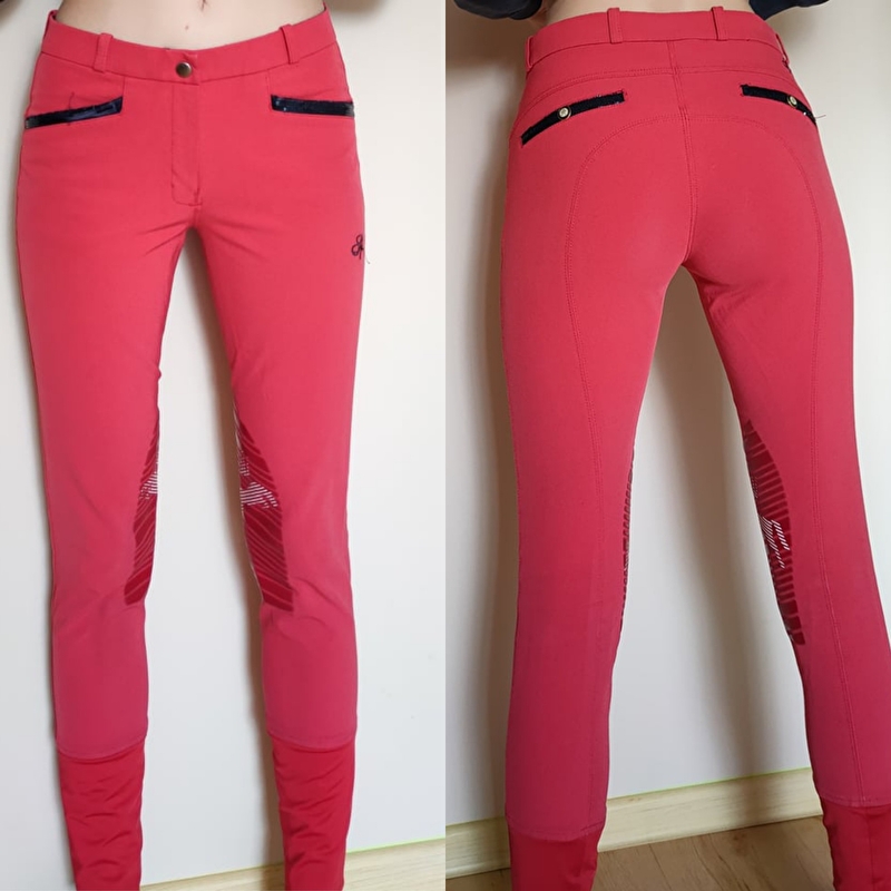 Bryczesy czerwone Spooks. Z fajnymi cekinami przy kieszeniach lekkie naderwanie tego szwu od "wewnątrz" Generlanie stan bardzo dobry mają lekkie ślady użytkowania. Do przeprania, na leju lekko zabrudzone. Rozm 32pas 32cmx2, biodra 37cmx2, dł 88cm Standardowy stan