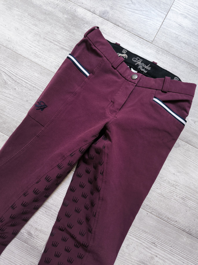 Bryczesy spooks. Bordowe piękny kolorek. Funkcjonalna kieszeń na udzie która docenia Amazonki. Wygodny materiał. Bardzo fajny model. Stan bardzo dobry, ale mają ślady wielu pran, lej silikonowy jest jak nowy! Rozmiar 32 xxs pas 32 cm x2 biodra 37 cm x2 dl całkowita 88 cm standardowy stan