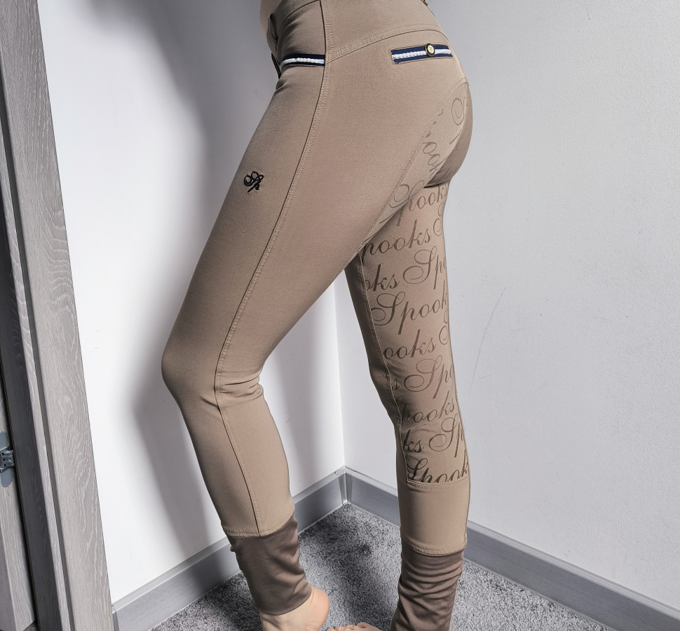 Bryczesy spooks. Beżowe. Kolor idelany na treningi i być może również na zawody jeździeckie. Chłodny bez jak na ostatnich zdjęciach. Wygodne stylowe z koralikami na kieszeniach. Jedno lekko naderwane. Nogawka Flexi. Stan bardzo dobry, lekkie ślady użytkowania Na leju. Małe przybrudzenie z tyłu jak na zdjęciu. Rozmiar S pas 36 cm x2 biodra 42 cm X2 dl całkowita 88 cm standardowy stan