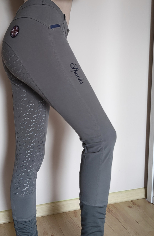 Bryczesy spooks. Szare z bardzo ciekawym lejem. Silikon z brokatem. Nadaje to bryczesom inności i sprawiają że wyglądają bardzo fajnie i stylowo. Super model. Wygodny. Stan bardzo dobry bardzo delikatne ślady użytkowania. Rozmiar 36 S pas 36 cm x2 biodra 40 cm x2 dl całkowita 88 cm standardowy stan