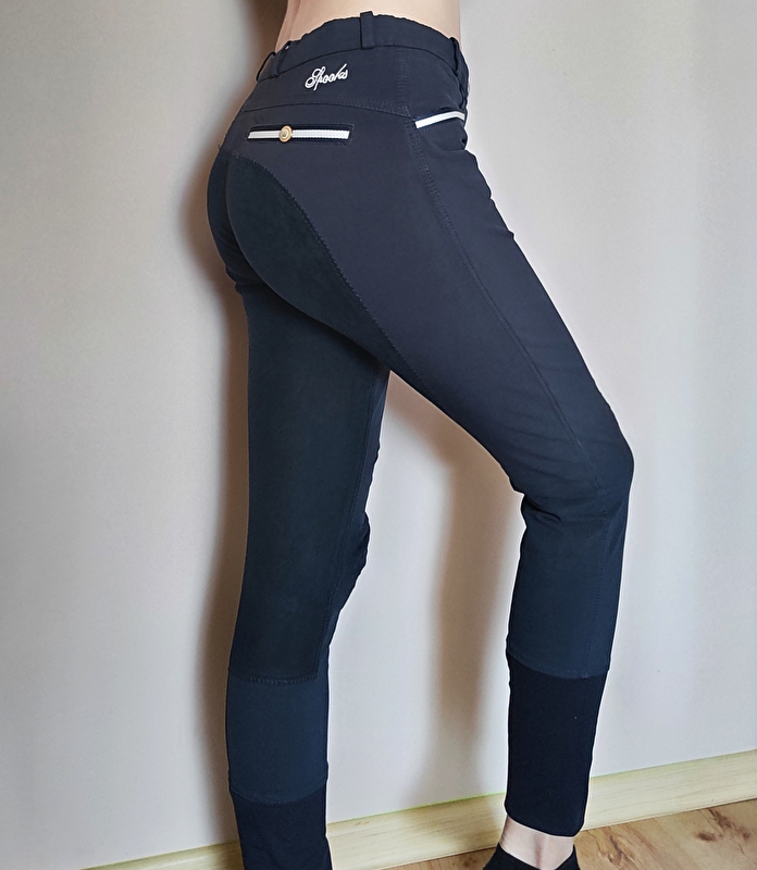 Bryczesy spooks.granatowe. Z pełnym zamszowym lejem. Wygodne, polecane przez wielu jeźdzców. Nogawka flexi. Spodnie ładnie dopasowują sie do ciała. Stan bardzo dobry z lekkimi sladami uzytkowania na materiale, kwestia prań. Nie maja wad. Rozmiar L pas 41cmx2, biodra 45cmx2, dł calkowita 91cm standardowy stan